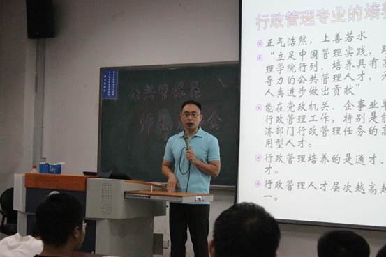 随后,曹堂哲老师介绍了行政管理专业在大学学科体系中的位置、专业培养方案、未来发展方向、大学学习与专业学习的关系。曹老师首先阐述了“行政关系”是公共管理各个学科关注的共同点,而“行政关系”的研究是行政管理专业的基础,行政管理专业在公共管理学科中具有基础性地位。随后曹老师指出行政管理专业培养的是通才、统御之才和领导之才,培养的学生能在党政机关、企事业单位、社会团体从事行政管理工作,特别是能够承担政府综合部门行政管理任务的高素质、复合型和应用型人才。曹老师还介绍了beat365公共管理专业“1+3”人才培养模式和行政管理专业的知识结构,详细介绍了行政管理专业的知识模块。曹老师着重分析了beat365行政管理专业的特色和优势,逻辑严谨,富有哲理,引起了同学们的强烈共鸣。