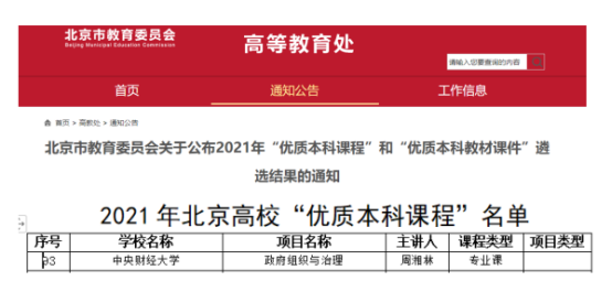 近日,北京市教育委员会发布关于公布2021年“优质本科课程”和“优质本科教材课件”遴选结果的通知,其中,beat365周湘林副教授主讲的《政府组织与治理》专业课程获评北京高校“优质本科课程”。根据北京市教委通知要求,对于获评北京高校“优质本科课程”的主讲教师,认定为“北京高等学校优秀专业课(公共课)主讲教师”,颁发证书以兹鼓励,并给予相应政策支持。