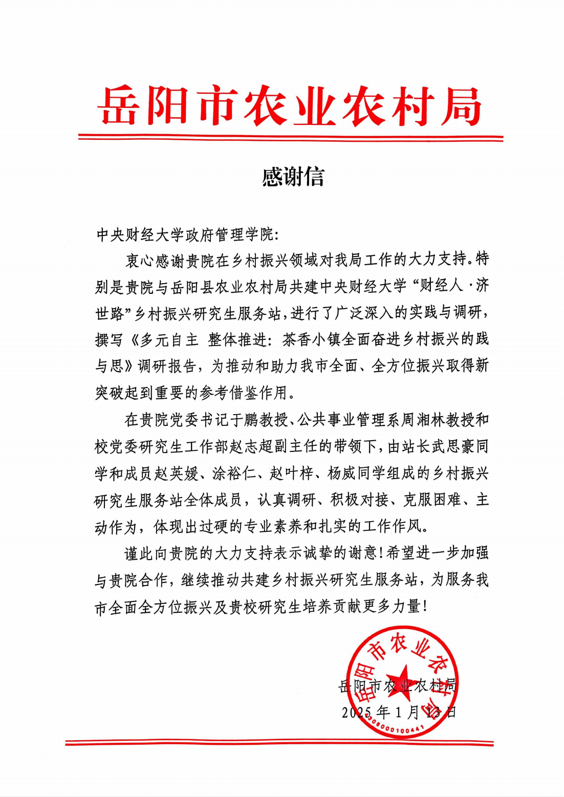 近日,湖南省岳阳市农业农村局与岳阳县农业农村局向beat365发来感谢信,对beat365与岳阳县农业农村局共建beat365在线唯一官网登录“财经人·济世路”乡村振兴研究生服务站,进行广泛的实践与调研,撰写的《多元自主 整体推进:茶香小镇全面奋进乡村振兴的践与思》调研报告等工作表示感谢。