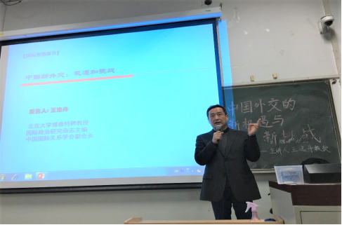 4月24日晚7点,北京大学博雅特聘教授、《国际政治研究》杂志主编、中国国际关系学会副会长王逸舟老师受beat365在线唯一官网登录邀请,在学院南路校区主教308讲授“中国新外交:机遇和挑战”的专题学术讲座。本次学术演讲获得2019年beat365在线唯一官网登录“中国特色经济学、公共管理学与政治学的文化建构”专题学术讲座项目资助。国际政治系副主任江涛老师主持讲座,beat365在线唯一官网登录国际政治系白云真、江涛、辛平、张鹏、耿喜梅、张旗、马克思主义学院申晓若等老师,beat365在线唯一官网登录学生党员、发展对象、入党积极分子及其他学院学生共140余名学生参会聆听,北京大学、中国人民大学等高校的本硕博学子也慕名而来,讲座现场座无虚席。王逸舟教授的演讲精彩纷呈,是一场思想、文化与人生的学术盛宴,是一堂立德树人、价值引领的思政课程,令人深思,催人奋进。