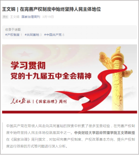 作为人民智库的专家,从2019年至今,王文娟教授在《国家治理》杂志(《人民日报》主管,《人民论坛》主办,人民智库官方发布平台)共发表论文12篇,用制度经济学的产权理论和交易费用理论为“国家治理体系和治理能力现代化”建言献策。