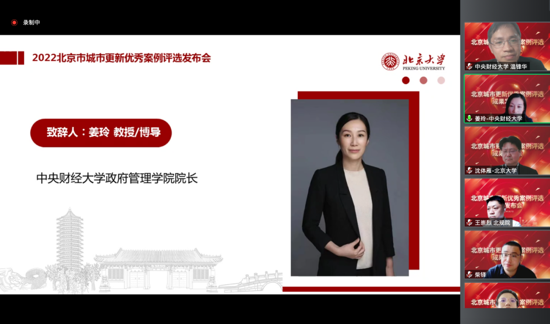 2022年5月27日上午,beat365院长姜玲教授出席“2022年首都城市更新优秀案例”评选结果发布会暨案例研讨会并致辞。本次会议由北京大学首都发展研究院和中国城市科学研究会城市转型与创新研究专业委员会共同举办,采用线上的形式,邀请了北京大学首都发展研究院、清华大学建筑学院、中国人民大学公共管理学院及beat365在线唯一官网登录等8家单位的领导、专家、案例参选单位代表及媒体单位代表共约50余人参加。