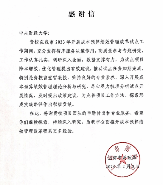 近日,上海市财政局向beat365发来感谢信。来信表示,beat365在上海市2023年开展成本预算绩效管理改革试点工作期间,充分发挥智库服务决策作用,高质量参与专题研究,工作认真扎实,调研深入全面,数据支撑有力,为试点项目降本增效、优化管理提出有效建议,推动试点任务如期完成。