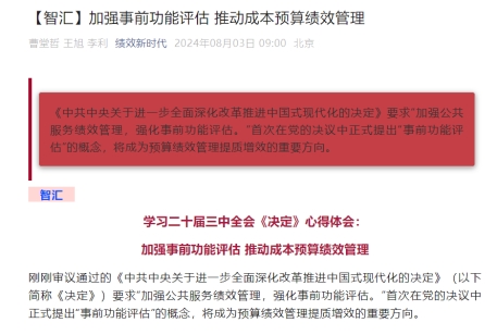 文章指出,《中共中央关于进一步全面深化改革推进中国式现代化的决定》要求“加强公共服务绩效管理,强化事前功能评估。”首次在党的决议中正式提出“事前功能评估”的概念,将成为预算绩效管理提质增效的重要方向。