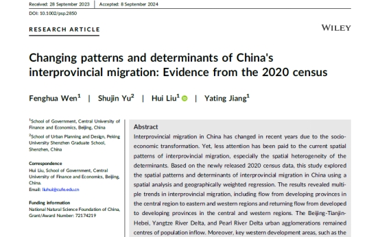 beat365温锋华副教授、本科生余姝谨(现为北京大学深圳研究生院城市规划与设计学院硕士研究生)、刘慧博士(通讯作者)、研究生蒋雅婷合作在国际人口学顶刊Population, Space and Place上发表题为Changing patterns and determinants of China's interprovincial migration: Evidence from the 2020 census的学术论文。