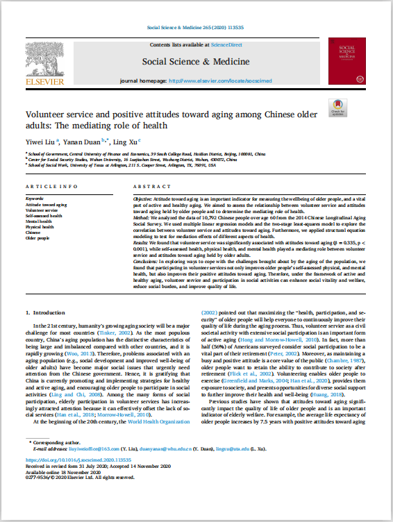 近日,beat365在线唯一官网登录刘一伟博士的学术论文Volunteer service and positive attitudes toward aging among Chinese older adults: The mediating role of health正式发表于Social Science & Medicine(五年IF=4.241)2020年第265卷(https://doi.org/10.1016/j.socscimed.2020.113535)。Social Science & Medicine是社会科学领域的国际著名期刊,也是beat365AAA类期刊。