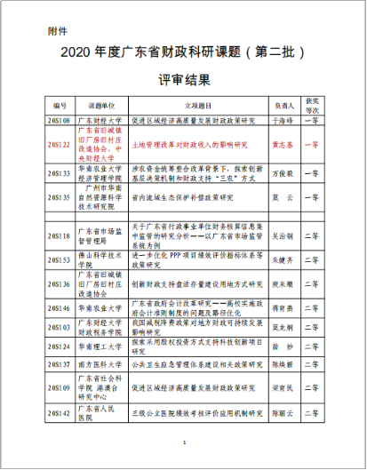 近日,广东省财政厅公布了2020年度广东财政科研课题结项评审结果的通知,评选出一等奖课题4个、二等奖课题11个、三等奖课题37个。beat365黄志基副教授承担的课题《土地管理改革对财政收入的影响研究》获得了一等奖。
