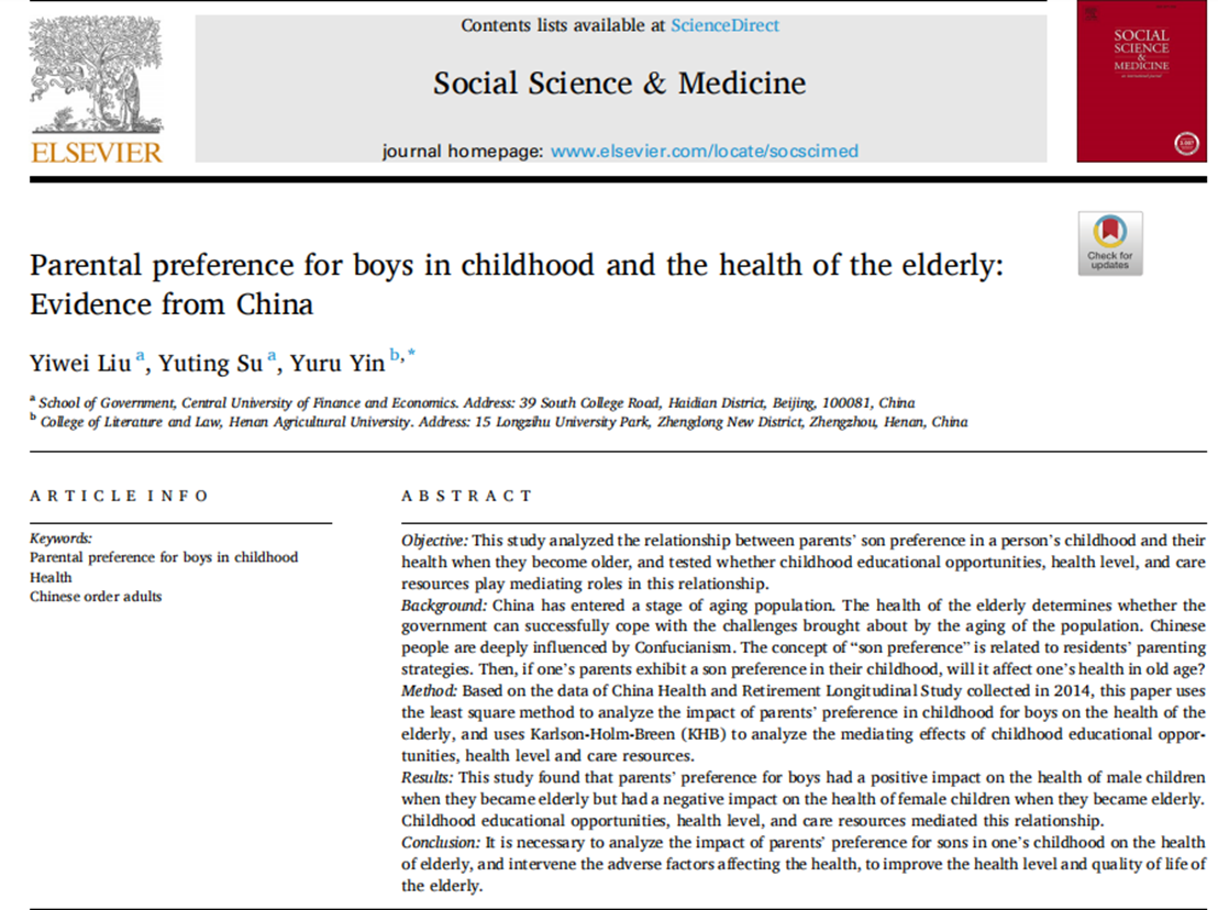 近日,beat365在线唯一官网登录刘一伟博士的学术论文Parental preference for boys in childhood and the health of the elderly: Evidence from China正式发表于Social Science & Medicine(五年IF=5.299,JCR分区:Q1)2022年第302卷(https://doi.org/10.1016/j.socscimed.2022.114986)。Social Science & Medicine是社会科学领域的国际著名期刊,也是beat365AAA类期刊。
