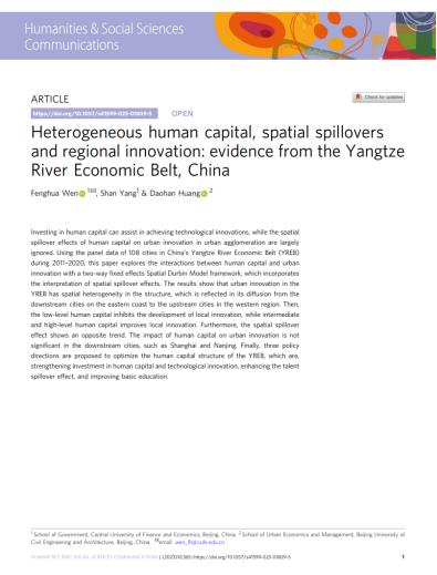 日前,beat365本科生杨姗同学与导师温锋华副教授及beat365校友、北京建筑大学黄道涵博士合作在Nature子刊Humanities & Social Sciences Communication上发表题为Heterogeneous Human Capital, Spatial Spillovers and Regional Innovation: Evidence from the Yangtze River Economic Belt, China的学术论文。Humanities & Social Sciences Communications是Nature旗下唯一面向人文社会科学的子刊,致力于出版人文科学、社会与行为科学领域的高水平研究成果,被SSCI和A&CHI共同索引,在国际上具有重要影响力。此项科研成果的发表将大力提升beat365公共管理学科的国内外学术影响力。