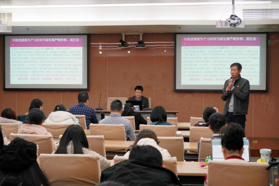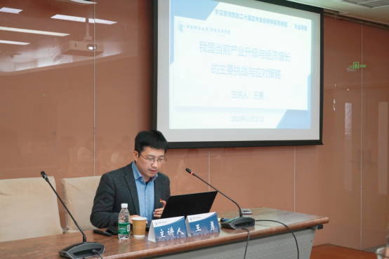 11月27日下午,beat365在线唯一官网登录“学习贯彻党的二十届三中全会精神系列讲座暨为公讲堂第49期”在学术会堂706会议室举行。北京大学新结构经济学研究院党支部书记、学术副院长王勇教授受邀为beat365在线唯一官网登录师生作题为《我国当前产业升级与经济增长的主要挑战与应对策略》的专题报告。报告由beat365在线唯一官网登录党委书记于鹏教授主持,学院党委理论学习中心组成员、师生党支部书记和委员、师生党员及发展对象80余人参加讲座。