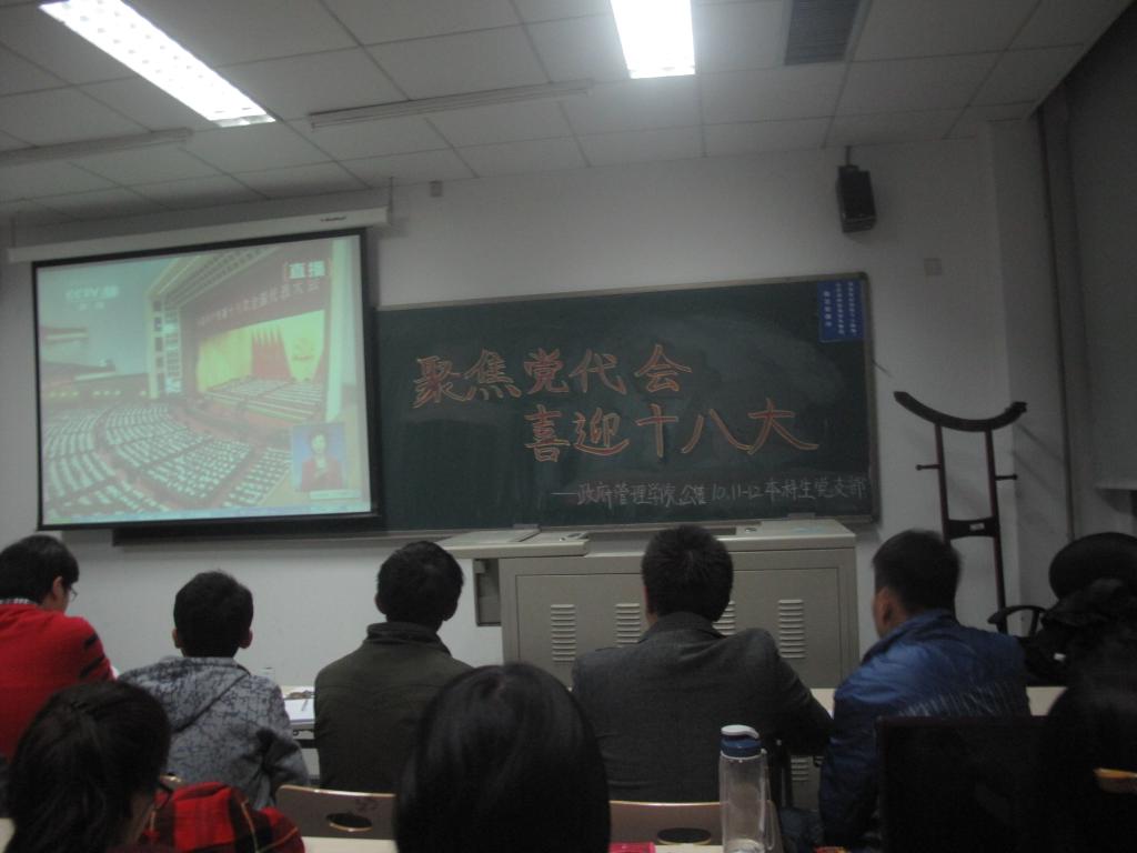 为认真学习党代会精神,2012年11月8日晚上七点,beat365在线唯一官网登录10公管本科生党支部及11、12级本科生党支部在学院3号楼218教室举行了主题为“聚焦党代会喜迎十八大”的党代会观看活动。本次活动由10公管党支部副书记徐世黔同学主持,共有三个年级27名党员、预备党员以及部分入党积极分子参与。通过观看大会,大家更加深入地认识到我党不断发展与时俱进的进取精神和求真务实的工作作风。