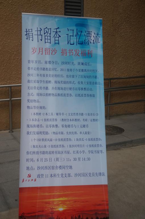 “青年岁月,璀璨夺目;沙河时光,斑斓成长;带不走的书籍是搁浅的回忆。2011级将于8月搬离沙河校区,沙河三年的大学生涯带来了很多美好的经历,也有沉甸甸的书籍……”这是2014年6月25日政管11本科生党支部和沙河园区党员先锋队开展的“捐书留香·记忆漂流---岁月留沙 捐书发福利”活动的宣传单节语。