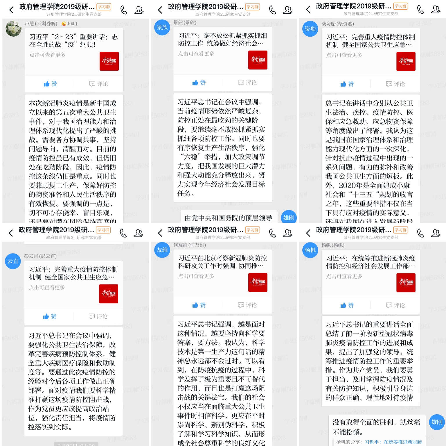 在线上集中学习过程中,党员同志们踊跃发言,相互交流了对习近平总书记《在统筹推进新冠肺炎疫情防控和经济社会发展工作部署会议上的讲话》的认识、理解及感悟。支部副书记杨帆表示,在党中央的坚强领导下,相信一定能够战胜这场疫情,保持我国经济社会的稳定发展,实现决胜全面建成小康社会的重要目标;卢慧认为习近平总书记的讲话对统筹疫情防控和经济社会发展提供了战略性高度的指导,在紧要关头,更要增强信心,用全面、辩证、长远的远光看待我国发展,同时思考了如何运用专业知识完善公共危机管理的问题;景欣从学生党员角度出发,明确要坚决支持和贯彻党中央的部署和决策,做到自身不放松警惕,提高思想认识,科学理性应对疫情。党员们积极发言,坚决支持和拥护党中央关于推进疫情防控和经济社会发展的部署与决策,表示要在疫情防控期间发挥好模范带头作用,积极配合学校及家乡当地完成好疫情联防联控工作,当先锋,作表率,做政治坚定、勇于担当的共产党员。