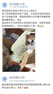 在此期间,领导班子化身“打包工”“搬运工”,登高爬床、俯身贴地,通过视频会议,对学生物品的细心归类,不断优化和完善大件行李打包的工作流程,明确装箱、称重、标签和交接等细节要求,为其他老师提供完整的打包攻略,领导班子高效率、高质量的工作为各位老师树立了良好的榜样,保障了后续工作的顺利进行。