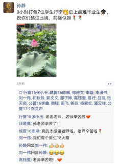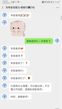 从4日早晨到5日黄昏,历时两天,随着交接组五位老师交接工作的顺利完成,随着最后一辆货车奔赴远方,毕业生行李打包及邮寄工作告一段落。“得知你们每一位都有了光明的前途,莫名增添了好多幸福感,衷心希望你们奋力向上成长、快乐生活!”这一辆辆货车承载着的不仅仅是毕业行李,更是老师对每一位学生的深切思念与衷心祝福。