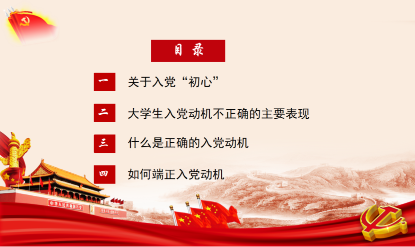 至此,本次入党积极分子党课第一讲圆满结束,同学们经由此次学习,深刻认识了端正入党动机的重要性,回忆了找寻“初心”的心路历程,明确了端正入党动机的途径,在丰富知识的同时坚定了为人民服务的信念。希望同学们能不忘初心、牢记使命,在实践中磨炼,早日以更加积极的面貌成为党组织的一员!