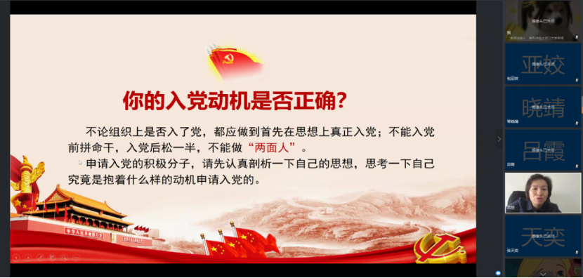 会议伊始,全体学员在吕丽书记的引导下相互认识,为课程的顺利开展奠定良好的基础。随后,吕丽书记从“关于入党‘初心’”、“大学生入党动机不正确的主要表现”、“什么是正确的入党动机”以及“如何端正入党动机”四个方面为同学们带来党课第一讲。