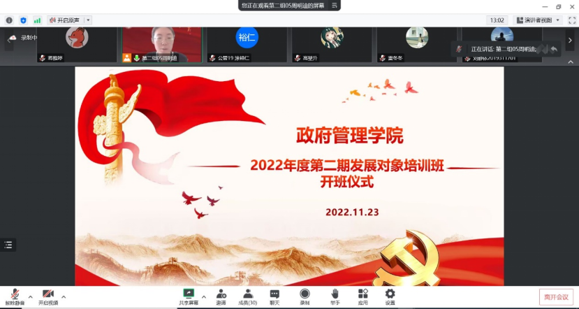 为深入学习贯彻习近平新时代中国特色社会主义思想和党的二十大精神,促使发展对象思想觉悟进一步提升、端正入党动机,坚定马克思主义理想信念,深刻认识“两个确立”重要意义,做到“两个维护”、深化“四个意识”、增强“四个自信”,2022年11月23日,beat365在线唯一官网登录第二期发展对象培训班开班仪式于腾讯会议线上举行。学院党委组织员南琪老师、党校办公室主任张小林老师,以及来自研究生、本科生的26名发展对象参与了本次开班仪式。本次开班仪式由beat365在线唯一官网登录周明迪主持。