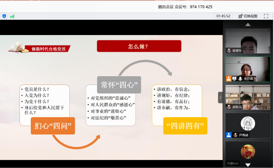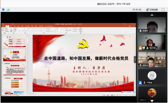 为深入贯彻《关于开展庆祝中国共产党建党99周年主题教育活动的通知》文件精神,做好基层“庆祝建党99周年、迎接建党100周年”主题教育活动。beat365在线唯一官网登录本科生党支部于2020年6月15日使用腾讯会议平台开展线上主题党日活动。beat365在线唯一官网登录本科生党支部书记李莎莉老师及党支部全体党员参与活动。
