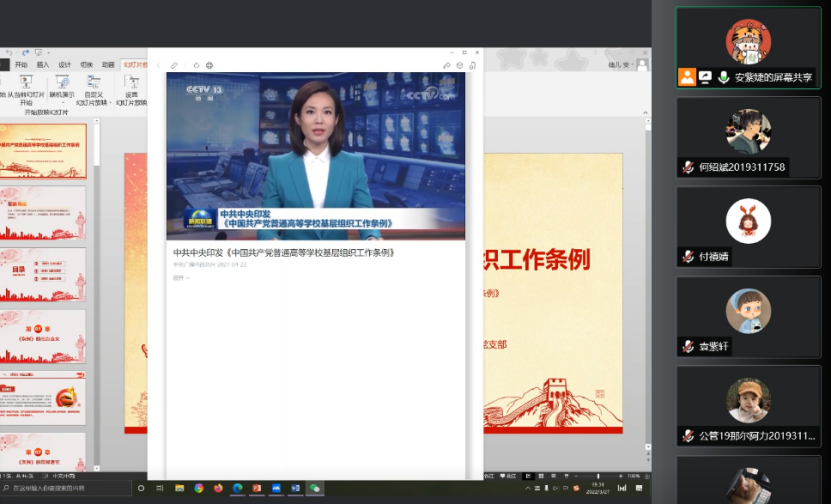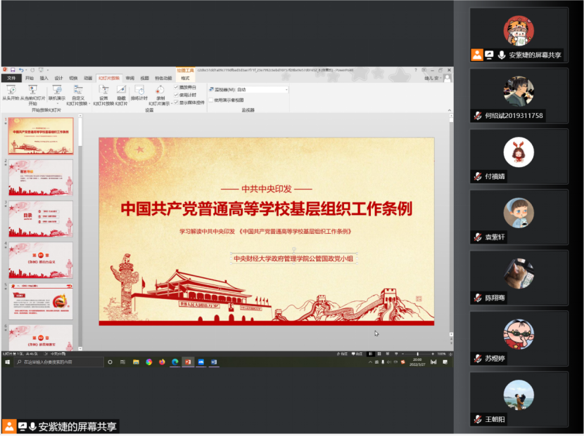 2022327日晚,beat365在线唯一官网登录本科生党支部公管国政小组通过腾讯会议的方式,在线上开展关于《中国共产党普通高等学校基层组织工作条例》(以下简称《条例》)专题学习会议,会议由安紫婕同志主持。