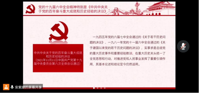 最后安紫婕同志带领大家集中学习领会了党的十九届六中全会精神特别是《中共中央关于党的百年奋斗重大成就和历史经验的决议》,一九四五年党的六届七中全会通过的《关于若干历史问题的决议》、一九八一年党的十一届六中全会通过的《关于建国以来党的若干历史问题的决议》,对推进党和人民事业发挥了重要引领作用,其基本论述和结论至今仍然适用。紫婕同志还为我们推荐了相关学习资料以方便大家进行深一步的了解。