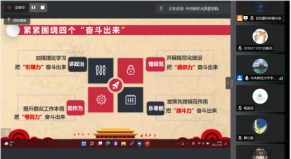 紧接着高度评价5年来在莎莉老师带领下的本科生党支部党建工作优异,认为支部制度健全、组织基础扎实、服务师生有力、支部特色鲜明、工作成效显著、党员群众认可、带动作用突出;鼓励同学们向身边的榜样看齐,不断丰富提升自我。最后从支部的建设和党员先锋模范作用的发挥两方面提出中肯建议。指出要加强政治引领力,对身边的团员群众进行思想引领;加强组织凝聚力,发挥优良的党内作风来引领院风、学风、班风、舍风建设;加强群众组织力,发挥团结服务师生作用;加强发挥推动力,促进学生全面发展。勉励同学们做政治上的明白人、学习生活上的示范人、老师同学的贴心人。