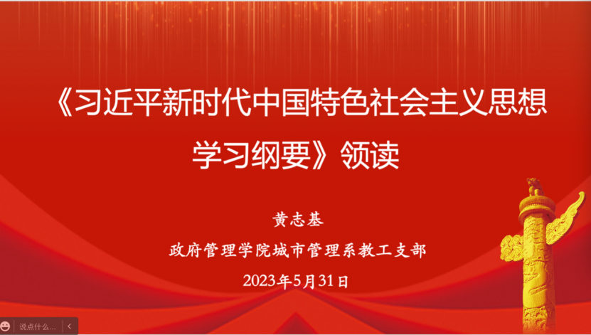 2023年5月31日中午12:30,beat365在线唯一官网登录城市管理系教工党支部在线上开展《习近平新时代中国特色社会主义思想学习纲要》专题学习活动。支部书记陈红霞老师主持会议,支部委员黄志基老师主讲。