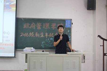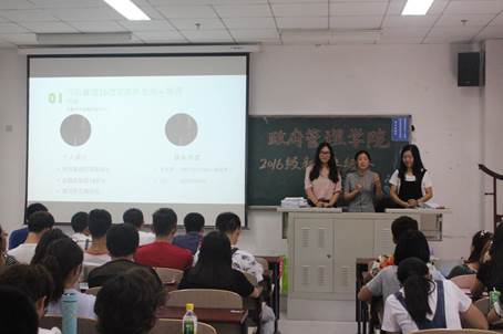 随后,宁钰皓老师为同学们介绍三名芮+导师,她们分别是担任国政16芮+导师的杨丹艺(注税14)、行管16芮+导师的杨晓(金实14)、公管16芮+导师的张芳(管会14)。在分别进行了自我介绍之后,三名芮+导师也传达了因事未至的公管16芮+导师张笑竹(投资14)对同学们的问候,在对芮+工作事宜进行了简单介绍之后,三名芮+导师进行了校团委与校学生会招新的宣讲,她们通过生动的PPT为新生们展示了各部门招新的情况,并鼓励新生们勇敢进行尝试,主动把握丰富多采的大学生活。