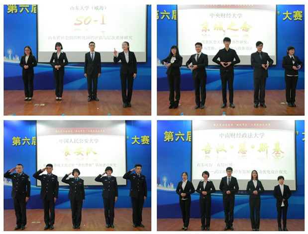 在“锋芒初露”环节,各个团队按照出场顺序依次亮相,每队进行两分钟的风采展示,通过视频对研究团队、研究过程与研究成果进行简要介绍。来自山东农业大学的五岳独尊队试图结合自己所学,探求泰安市梳洗河的治污良策。来自山东大学的SO-I队对社会组织孵化园进行多次实地调研,希望引起决策者和民众的高度关注。来自beat365在线唯一官网登录的经纬匠心队提出响亮口号,强调“以人为本是我们的坚持,街道复兴是我们的目标,使城市重焕生机是我们的追求”。来自清华大学的星火队聚焦“脱贫攻坚”热词,思考脱贫攻坚战中,为何外来的将军打得响。来自中国人民公安大学的食安队肩负打击食药犯罪的使命感,为北京“食药警察”建设出谋划策、贡献力量。来自beat365在线唯一官网登录的京城之念队深入挖掘医患纠纷根本,细致解读纠纷解决机制,努力构建和谐的医患关系。来自中南财经政法大学的吾汉·慧·斯基队探究武汉市智慧停车的现状和优化设计,发展目标是构建畅通的武汉城市。来自青岛科技大学的天生一队以山东青岛市为例,对城市管理体制改革与创新进行深入研究。来自中国人民大学的P2P队秉承明德善治的苍生情怀,对承德市滦平县PPP扶贫模式进行探讨。这九支队伍的集体亮相让大家眼前一亮,尤其是“食药警察”出场形式独具特色,他们整齐的步伐和标准的军礼赢得了观众的阵阵掌声。