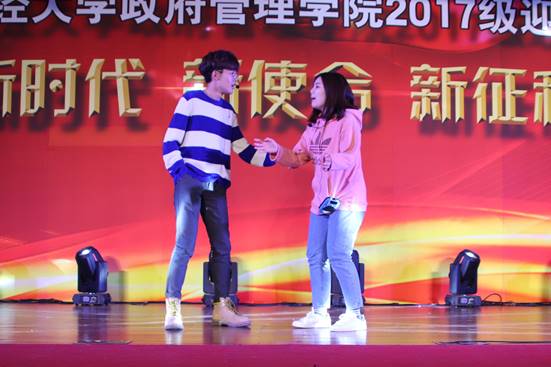 17级公管1班、2班的同学们携手带来了小品《毕业》。同学们创意无限,脑洞大开,在欢声笑语中引导在座新生处理第一课堂和第二课堂的关系。