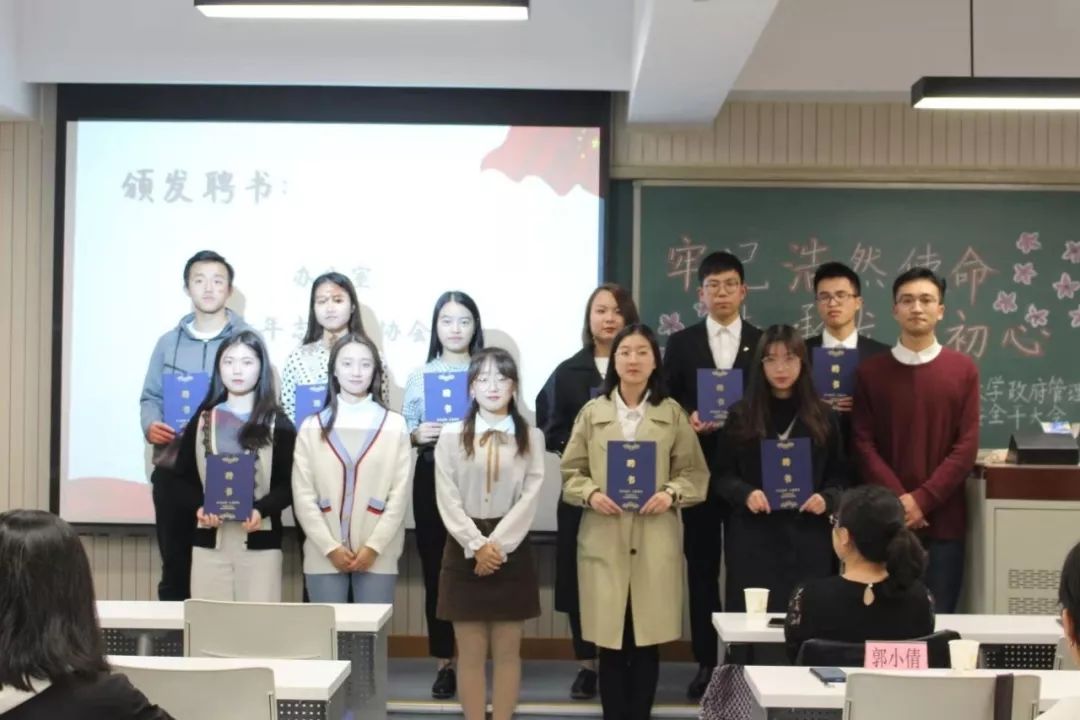 随后,刘家琦老师宣读学生会任职名单,党委副书记白云真副教授、团委书记李莎莉老师、主席团以及社团负责人分别为主席团成员、社团负责人以及各部门部长颁发了聘书。伴着激昂的乐声,团委学生会上任部长代表们与新任部长们交接部旗,各部门部长为新干事佩戴团徽。
