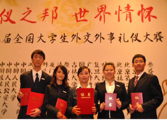由外交部和外交学院组织,旨在普及大学生外交外事礼仪知识、提高大学生国际化水平,进而促进中国国际交往的“第九届全国大学生外事外交礼仪大赛”,于2010年10月30日在钓鱼台大酒店落下帷幕。由beat365选派的09国政陈瑶瑜、李松霖,09心理特日格乐,09保险刘明浩组成的代表队经过两轮紧张角逐,最终从包括北京大学、清华大学、中国人民大学、复旦大学、浙江大学等在内的全国22支高校参赛队中脱颖而出,凭借其突出表现获得比赛第二名,冠军由外交学院夺得。