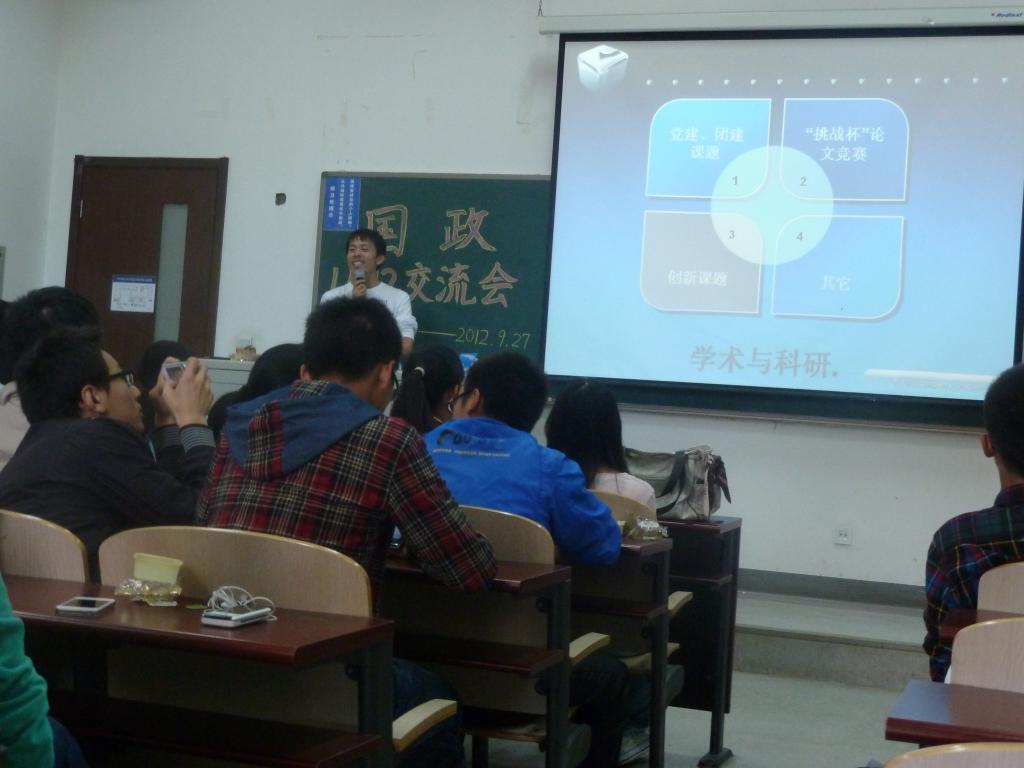 接着,11国政由三名同学分别介绍了学习考试、学术科研、社团活动,可以说,这三大方面几乎涵盖了大学生活的大部分内容。学长学姐们在传递经验的同时,也告诫了学弟学妹们面对众多选择时要学会自我调控、有所侧重。