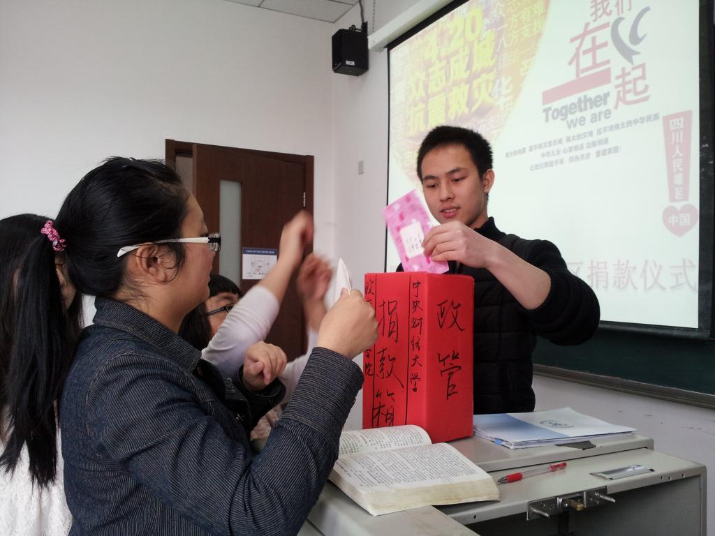 4月24日上午10点,沙河校区主教302由beat365在线唯一官网登录国际政治12班举行了短暂的为四川地震灾区募捐活动。4月20日,四川省雅安市发生7.0级地震,之后大小余震接二连三,灾区的实时消息无不牵动着每位国人的心。因此,beat365在线唯一官网登录国际政治12班同学联合发起号召向灾区募捐,用微薄之力表达爱心。