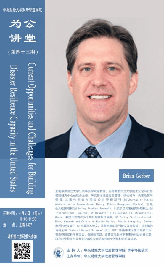 嘉宾简介:Brian Gerber,亚利桑那州立大学公共事务学院副教授,亚利桑那州立大学国土安全与应急管理研究中心的联合主任。研究领域涵盖应急管理、韧性城市、灾害政策与管理。其著作发表在顶级公共管理期刊(如Journal of Public Administration Research and Theory, Public Management Review),顶级公共政策期刊(如Policy Studies Journal), 以及顶级灾害研究的期刊上(如International Journal of Disaster Risk Reduction, Disasters)。Gerber教授正或曾在多个知名期刊担任编委,如Policy Studies Journal, Risk, Hazards and Crisis in Public Policy, Public Integrity。Gerber教授已经发表了30余篇学术论文,具备丰富的顶刊论文发表经验,其主编的百科全书”Natural Hazard Science”也于2021年由牛津大学出版社出版。曾获得国家科学基金会、美国教育部、西弗吉尼亚州军事事务和公共安全部、以及科罗拉多州公共安全部火灾预防和控制处等机构的研究资助。