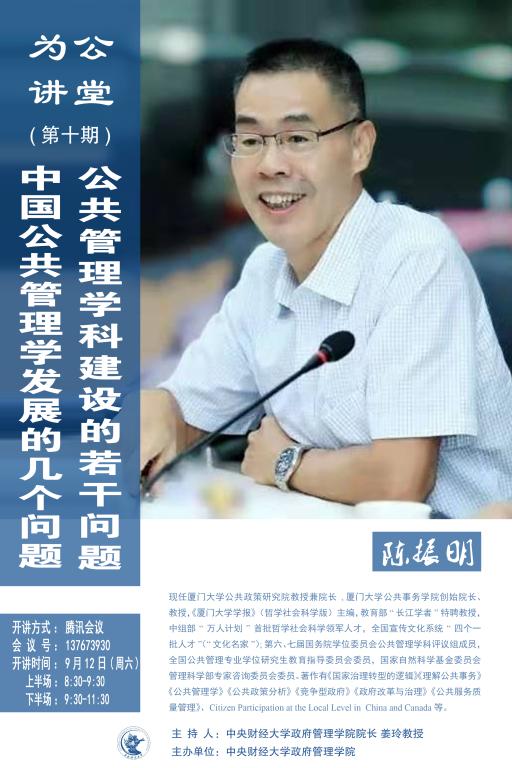 嘉宾简介:陈振明,现任厦门大学公共政策研究院教授兼院长, 厦门大学公共事务学院创始院长、教授,《厦门大学学报》(哲学社会科学版)主编,全国宣传文化系统“四个一批人才”(“文化名家”);第六、七届国务院学位委员会公共管理学科评议组成员,全国公共管理专业学位研究生教育指导委员会委员,国家自然科学基金委员会管理科学部专家咨询委员会委员。著作有《国家治理转型的逻辑》《理解公共事务》《公共管理学》《公共政策分析》《竞争型政府》《政府改革与治理》《公共服务质量管理》、Citizen Participation at the Local Level in China and Canada等。