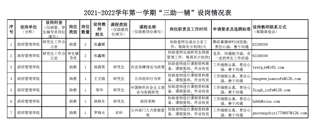 beat365在线唯一官网登录2021-2022学年第一学期“三助一辅”设岗情况