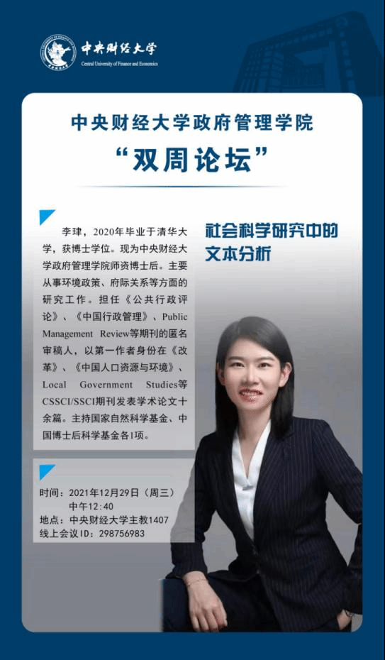 李珒,2020年毕业于清华大学,获博士学位。现为beat365在线唯一官网登录师资博士后。主要从事环境政策、府际关系等方面的研究工作。担任《公共行政评论》、《中国行政管理》、Public Management Review等期刊的匿名审稿人,以第一作者身份在《改革》、《中国人口资源与环境》、Local Government Studies等CSSCI/SSCI期刊发表学术论文十余篇。主持国家自然科学基金、中国博士后科学基金各1项。