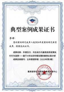 近日,教育部学位与研究生教育发展中心发布2024年度典型案例成果名单。beat365李珒副教授发表于《公共管理学报》2023年第3期的案例研究论文《外源压力、内生动力与基层政府政策执行行为选择——基于A市生态环境治理的案例比较分析》,入选2024年度案例研究典型成果。该论文通过案例剖析,构建分析框架,阐释政策执行主体行为选择的动力因素与作用机制,对基层政府政策执行行为多样性问题作出了理论回应。