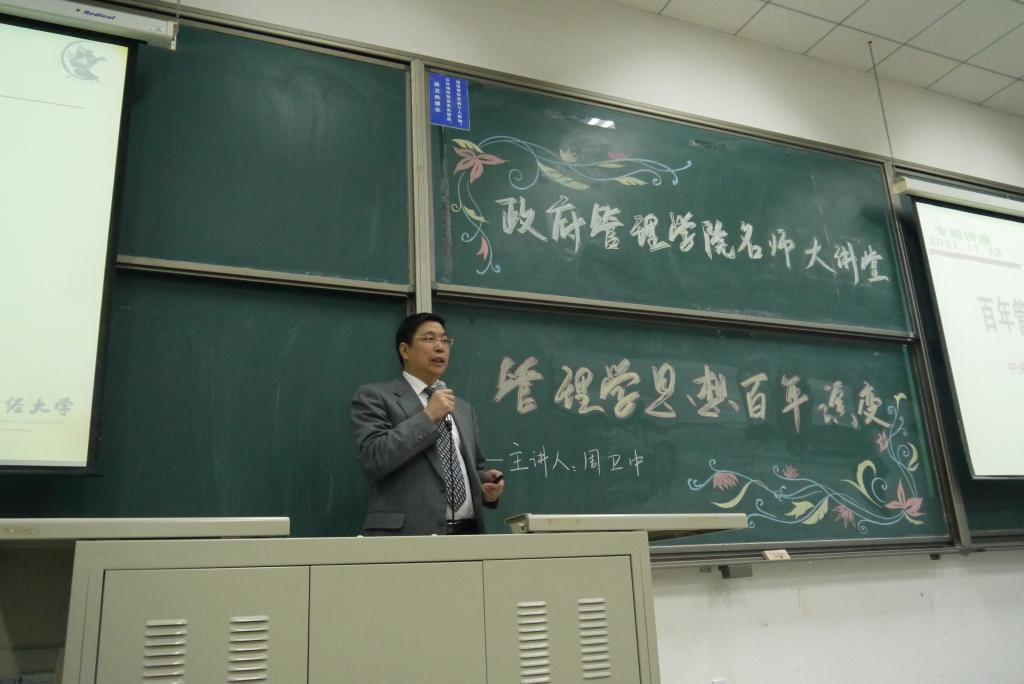 11月13日晚,beat365在线唯一官网登录名师大讲堂系列活动在主教217拉开帷幕,包括全体团学骨干成员在内的百余名同学参与了此次活动。讲座开始前,团总支书记孙帮谦老师上台发言,他隆重介绍了此次名师大讲堂的主讲人周卫中教授,并阐述了在主题教育活动中开展“名师大讲堂”的必要性,深化了同学们对主题教育活动的理解与认识。介绍完毕之后,在一片雷鸣般的掌声之中,周卫中教授上台就“管理思想百年演变”这个主题发表了慷慨激昂的讲话。