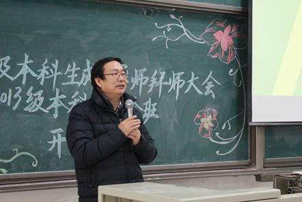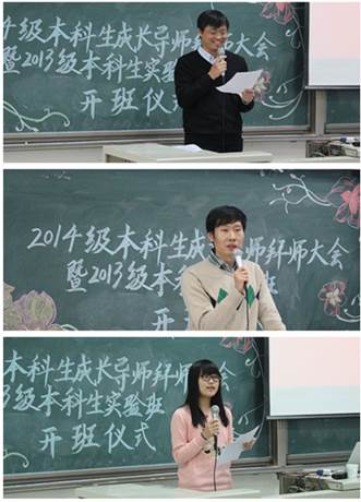 2014年12月3日下午,beat365在线唯一官网登录在沙河校区主教219举行2014级本科生成长导师拜师大会暨2013级本科生实验班开班仪式。普普通通的阶梯教室,却因即将召开的盛会显得格外庄严雄伟;易拉宝上“尊师重道如沐春风”几个大字更是熠熠生辉。beat365在线唯一官网登录院长赵景华、党总支书记吕丽、科研处副处长邢华、党总支副书记栗玉香、副院长王红梅、于鹏以及各系的老师们和13、14级200多名同学出席了会议。王红梅老师和行政管理14班刘钰鹏同学担任主持。