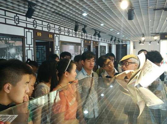 调研开始后,袁家方教授首先带领学生们来到位于前门大街黄金分割比例处的老字号——天津盛锡福三楼的中国冠帽文化博物馆进行参观。袁教授向大家介绍了前门与大栅栏的历史发展及有关盛锡福老字号的流传——三顶帽子见证百年历史,他还拿出自己标注的古代-近代-现代北京市商业空间分布及演化图与大家共享,向同学们介绍了北京商业空间的时空演化格局。袁教授几十年用心行走在北京的胡同和街道中,对老北京文化有着独到的见解,他的讲述有趣新颖,同学们都痴迷于其中,折服于先生无穷的学术研究与个人魅力。之后,同学们有幸占据了制高点——盛锡福三楼,一览整条前门大街的景观。