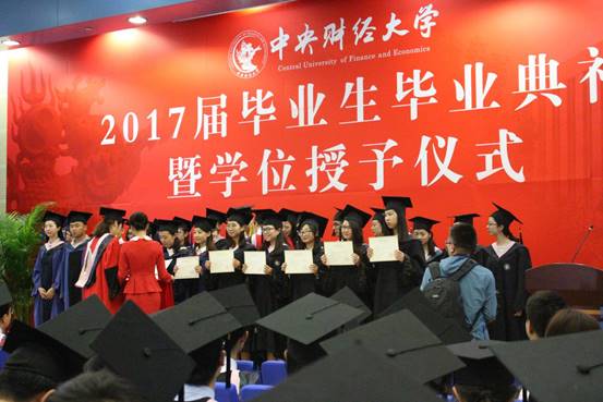 首先,在同学们热烈的掌声中,全体老师入场。随后,师生共同观看“青春政好,永不散场”毕业纪念视频,视频以“花季·雨季·彩虹”为线索,记录了2017届毕业生的学习感悟、生活点滴,诉说了中财学子对未来的展望与憧憬,同时也饱含了对母校与学院的眷恋和祝福,深深感染了在场的每一位同学。全体师生起立奏唱国歌,本次毕业典礼学位授予仪式正式开始。副院长姜玲老师宣读《关于2017届本科生毕业及授予学士学位的决定》和《关于2017届研究生毕业及授予学位的决定》,院党委书记吕丽宣读《关于表彰2017届本科优秀毕业生的通知》及《关于表彰2017届优秀毕业研究生的通知》。赵景华院长、姜玲副院长、院党委副书记白云真为优秀本科毕业生及优秀研究生毕业生颁发荣誉证书并与同学们合影留念。