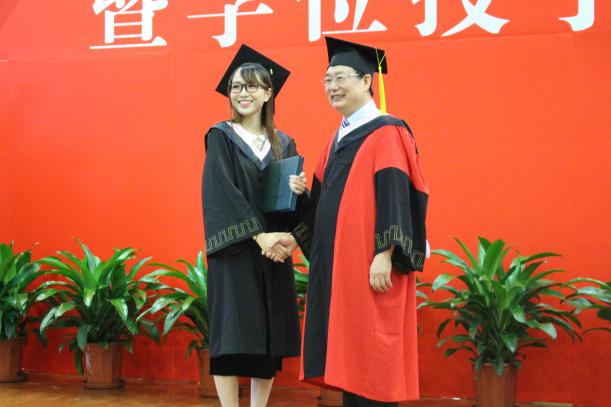 典礼最后进行了学位授予仪式。在庄严的乐曲中,赵景华院长为2017届毕业生逐一拨穗,颁发毕业证书和学位证书。赵院长与同学们握手、拥抱,合影留念,深深感染和鼓舞了每一位上台受礼的毕业生。大家纷纷鞠躬,表达了对母校以及学院全体老师的诚挚谢意。