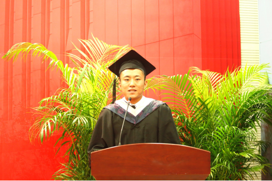 典礼进行第五项,毕业生代表发言。2018届本科生代表行政管理14班杨崇祺与2018届研究生代表学术型硕士16班朱洁相继发言。杨崇祺以轻松诙谐的语言道出了他一直深藏心间的三个感谢:感谢同学四年的帮助和相互扶持,让他感受到家的关怀与温暖;感谢老师的细心栽培和教授,师恩四年,永生难忘;感谢父母默默的支持,一路的成长离不开他们无悔的付出。最后,杨崇祺与所有的毕业生们分享了八个字:忠诚、团结、正气、担当,并祝愿老师亲友们身体健康,祝愿学院桃李满天下。接下来,朱洁作为研究生代表发言。朱洁在表达对学院和老师同学们的深深感谢之后,提出了思考:漫漫求学路,学院带给同学们的到底是什么?朱洁认为,大学之道,最重要的是教会他怎样做一个大写的人:做人上有格局与情怀,做事上懂责任与担当,做学问上崇尚真理与敢于质疑。朱洁认为学会做人,学会做一个大写的人,才能无愧于“中央政府人”的称号!最后,朱洁祝愿学院再创辉煌,祝愿老师们身体健康,祝愿学子们前程似锦!