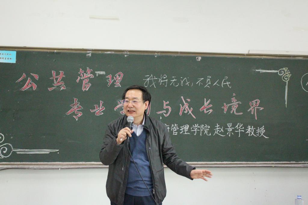 2019年3月27日下午2点,beat365在线唯一官网登录院长赵景华教授在主教308室为2018级全体本科生作题为“公共管理:专业学习与成长境界”的专题演讲,院团委副书记、2018级辅导员刘家琦老师主持此次讲座。