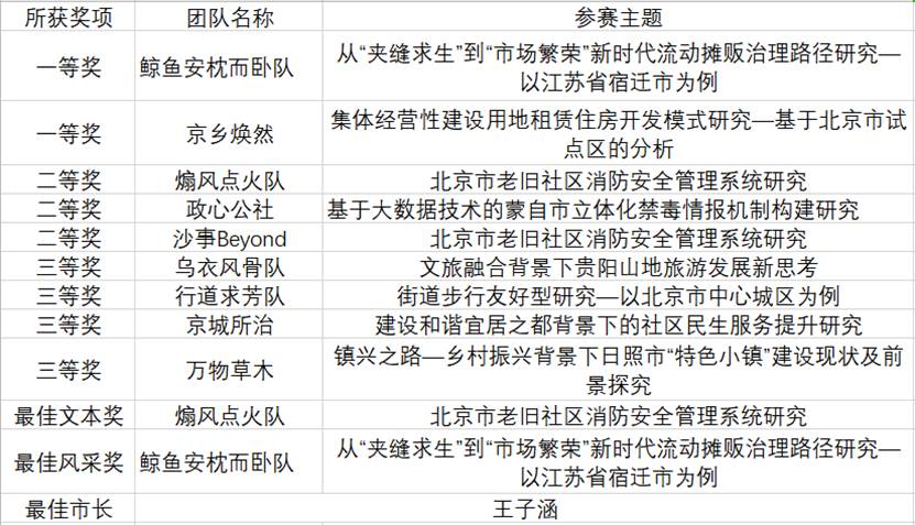乌衣风骨队由市长“微服私访”观察游客对服务区的满意度出发,从多角度提出改善高速公路服务区的方案;鲸鱼安枕而卧队从人大代表的实地调查视角切入,表现其对于城市流动摊贩治理机制的创新思考;行道求芳队通过记者实地采访场景引出问题,随后介绍了他们如何解决街道治理的难题;京城所治队通过社区居民的情景对话和市长会议,探索了北京市社区公共服务的有效供给途径;京乡焕然队模拟了村民会议和政府会议,分析集体土地资源开发利用的问题;政心公社队则从“毒源情报”出发,提出基于大数据技术的禁毒情报机制;沙事beyond队以沙河高教园区与未来科学城的产学研联动创新为切入点,提出北京科技创新和城市功能区发展的政策建议;万物草木队模仿电视节目和部门会议,探究日照市乡村特色小镇的建设发展方向;煽风点火队通过一次失火事件,提出如何打造高效的老旧小区的消防安全管理系统。