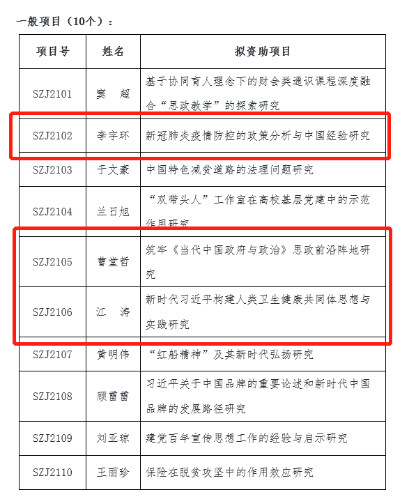 在2021年beat365在线唯一官网登录“红色擎,龙马行”教师“思政+”专项支持基金资助项目遴选工作中,beat365李宇环副教授申报的《新冠肺炎疫情防控的政策分析与中国经验研究》、曹堂哲教授申报的《筑牢<当代中国政府与政治>思政前沿阵地研究》和江涛副教授申报的《新时代习近平构建人类卫生健康共同体思想与实践研究》三项课题喜获立项资助(全校共10项)。