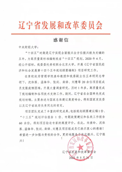 近日,辽宁省发展和改革委员会向beat365发来感谢信,对beat365beat365在线唯一官网登录负责完成的《辽宁省国民经济和社会发展第十四个五年规划纲要编制》的项目研究工作表示感谢。