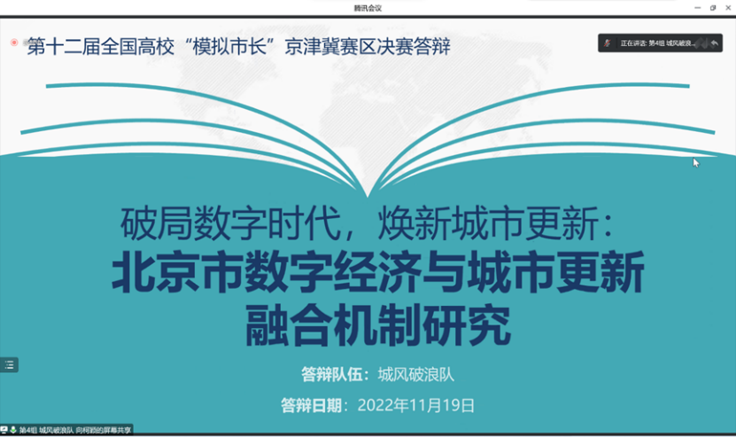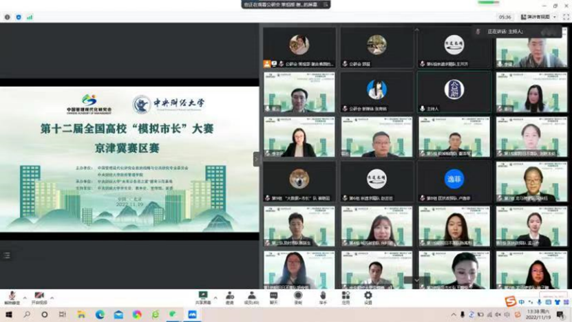 2022年11月19日下午,第十二届全国高校“模拟市长”大赛京津冀赛区赛举行。大赛由中国管理现代化研究会、政府战略与公共政策研究专业委员会、beat365在线唯一官网登录主办,“未来公务员之家”德育示范基地、公共管理研究会承办。本届模拟市长大赛京津冀赛区自8月分启动以来,共吸引十余所高校近260支队伍参赛,经专家评审,最终由来自中国人民大学,南开大学,中国传媒大学,beat365在线唯一官网登录的九支队伍入围京津冀赛区决赛。